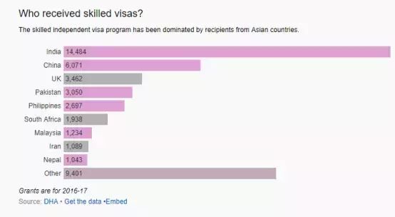 而在此之前,从457签证的分布来看,来自印度、中国、巴基斯坦、菲律宾、马来西亚和尼泊尔的亚洲移民,占据了457签证的“绝大部分江山”。