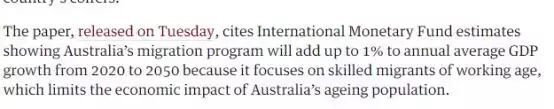而且报告中还指出,澳大利亚境内现存的各类移民项目,将在2020-2050年的30年内,每年至少为GDP做出1%的贡献!
